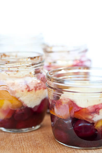 Tagliate a pezzi la frutta in 4 vasetti, snocciolate le ciliegie e unitele. Una volta divisa tutta la frutta, formate delle palline di impasto basse e piatte, larghe all’incirca quanto l’apertura del vasetto e disponetele sopra la frutta.