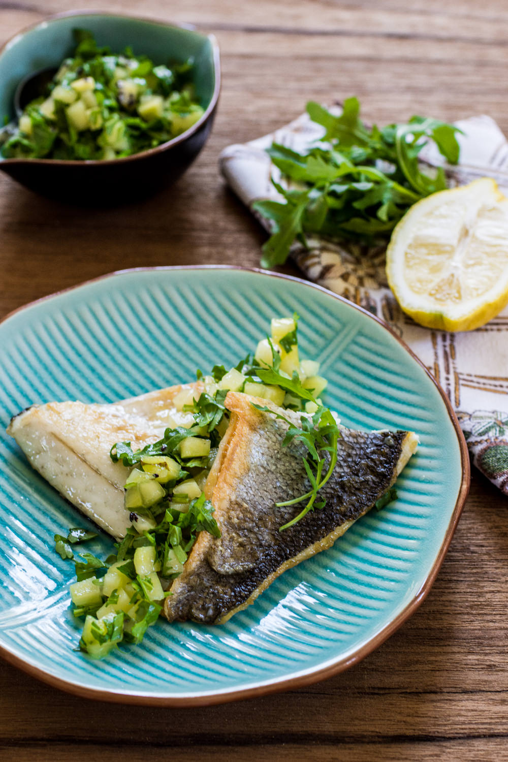 English Version –  Sea bream fillet with yellow kiwi tartare and rocket