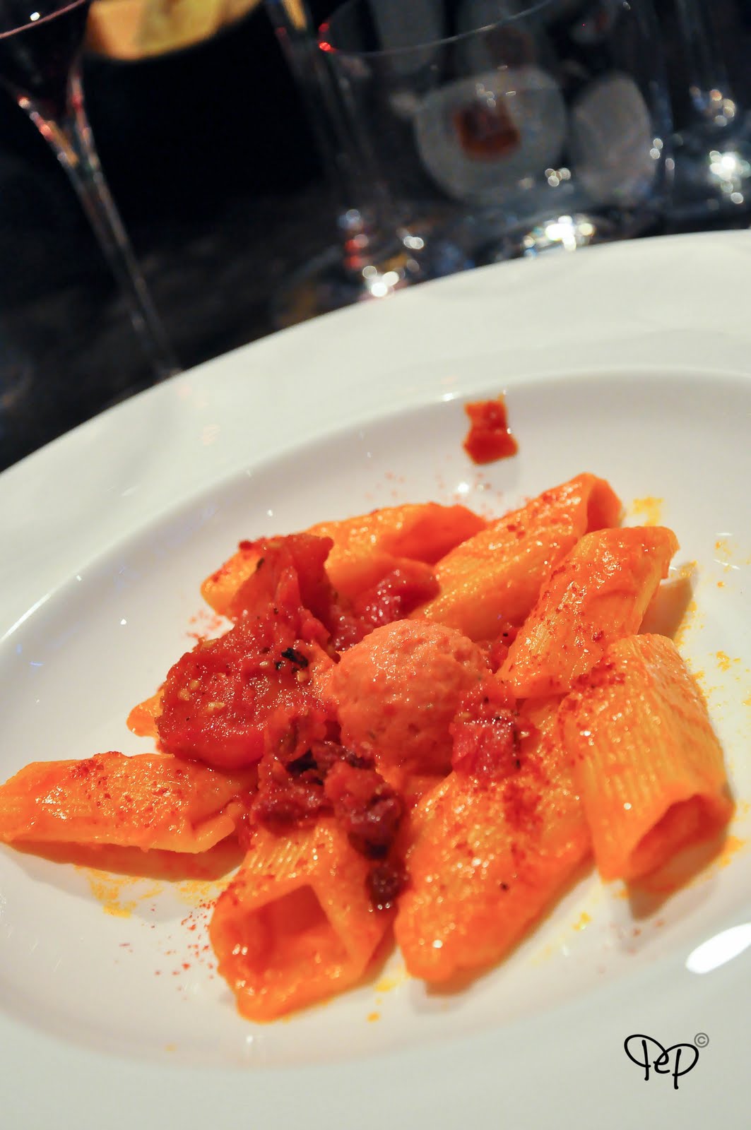 Penne quadrate giganti ferrigni tutto pomodoro, pachino, datterino, Torre Guaceto e Piennolo: uno splendido piatto realizzato con una selezione di 4 tipi di pomodori, lavorati ognuno in modo differente.