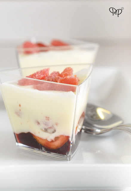 Preparare 4 bicchierini che userete per servire il dessert. Sul fondo di questi versate un cucchiaio di marmellata di fragole (o più secondo il vostro gusto). Sopra porvi la tettina di limone caramellato e poi le fragole essiccate tagliate a fettine.