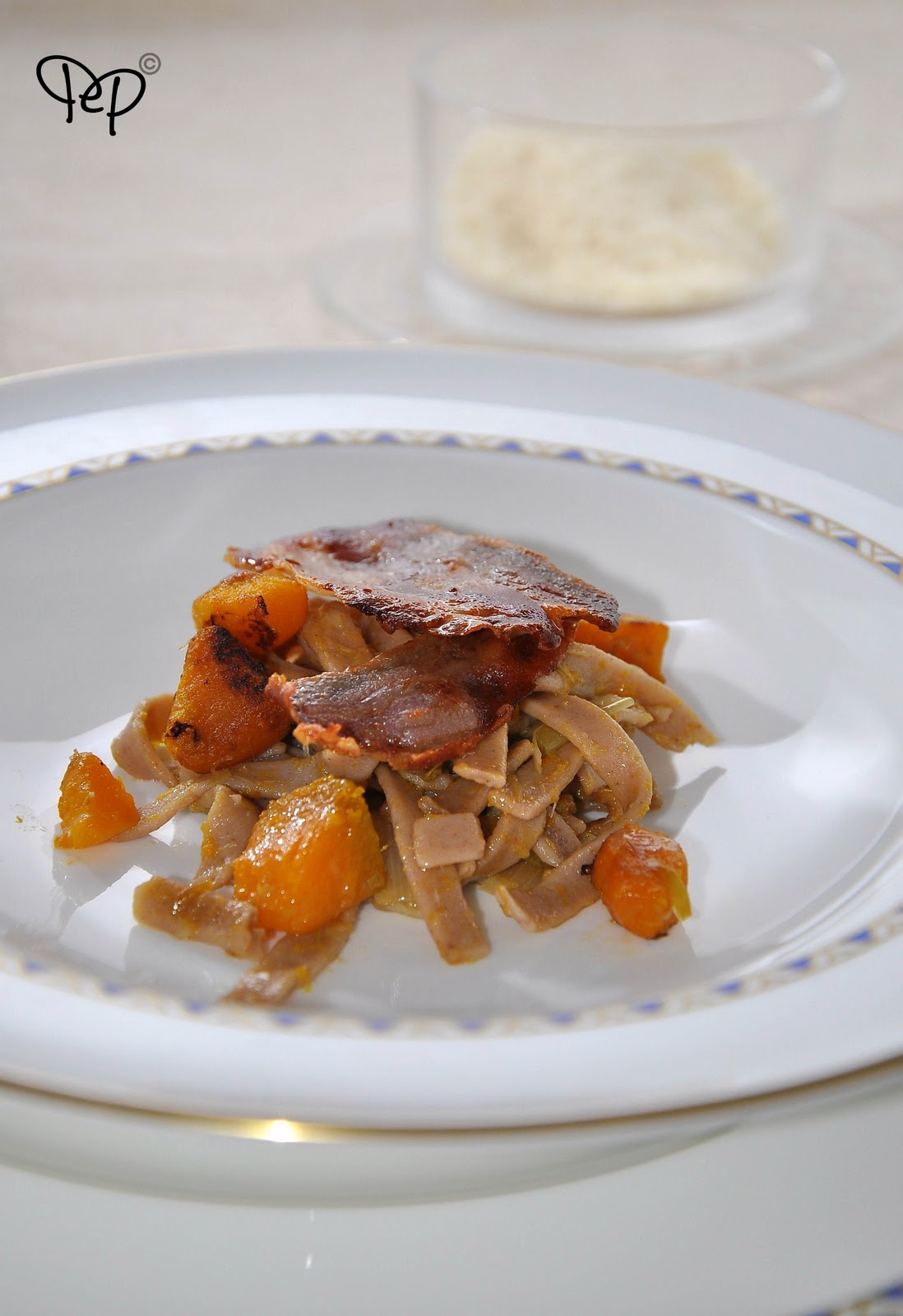 Tagliatelle di castagne con porri, zucca e chips di pancetta - Peperoni e Patate