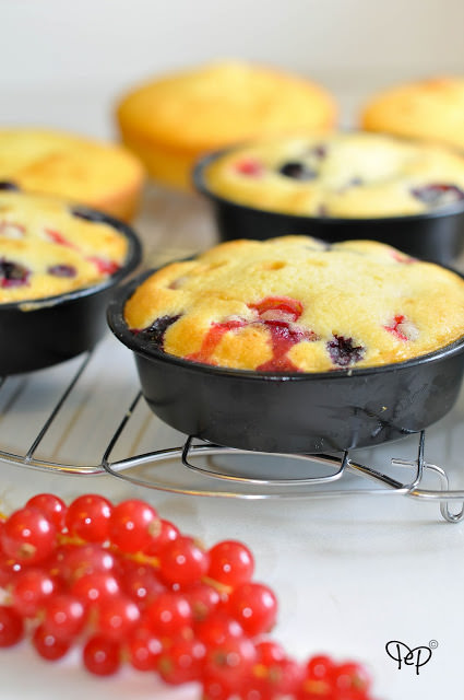 Scaldare il forno a 175°. Versare l’impasto in 3 tegliette riempendole per i 2/3. Al restante impasto aggiungere delicatamente i mirtilli e i ribes. Mescolare e dividere il composto nelle altre teglie.
