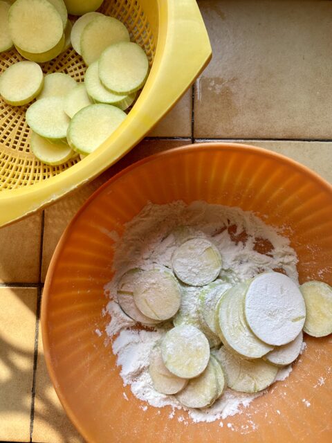 Lavate le zucchine e affettatele (io a rondelle, ma va bene anche per il lungo). Passatele nella farina e fatele friggere in abbondante olio. Una volta dorate, fatele asciugare su carta assorbente.