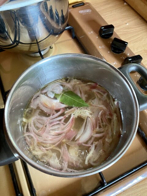 A parte scaldate un filo d’olio in una padella ampia insieme all’aglio schiacciato e la cipolla tagliata a fette sottili. Lasciate stufare a fuoco bassissimo finché la cipolla diventa trasparente.